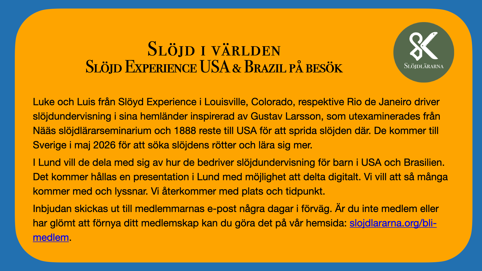 Invitation skickas ut till medlemmars e-post några dagar innan? Är du inte medlem eller har inte förnyat ditt medlemskap kan du göra det här: https://slojdlararna.org/bli-medlem/